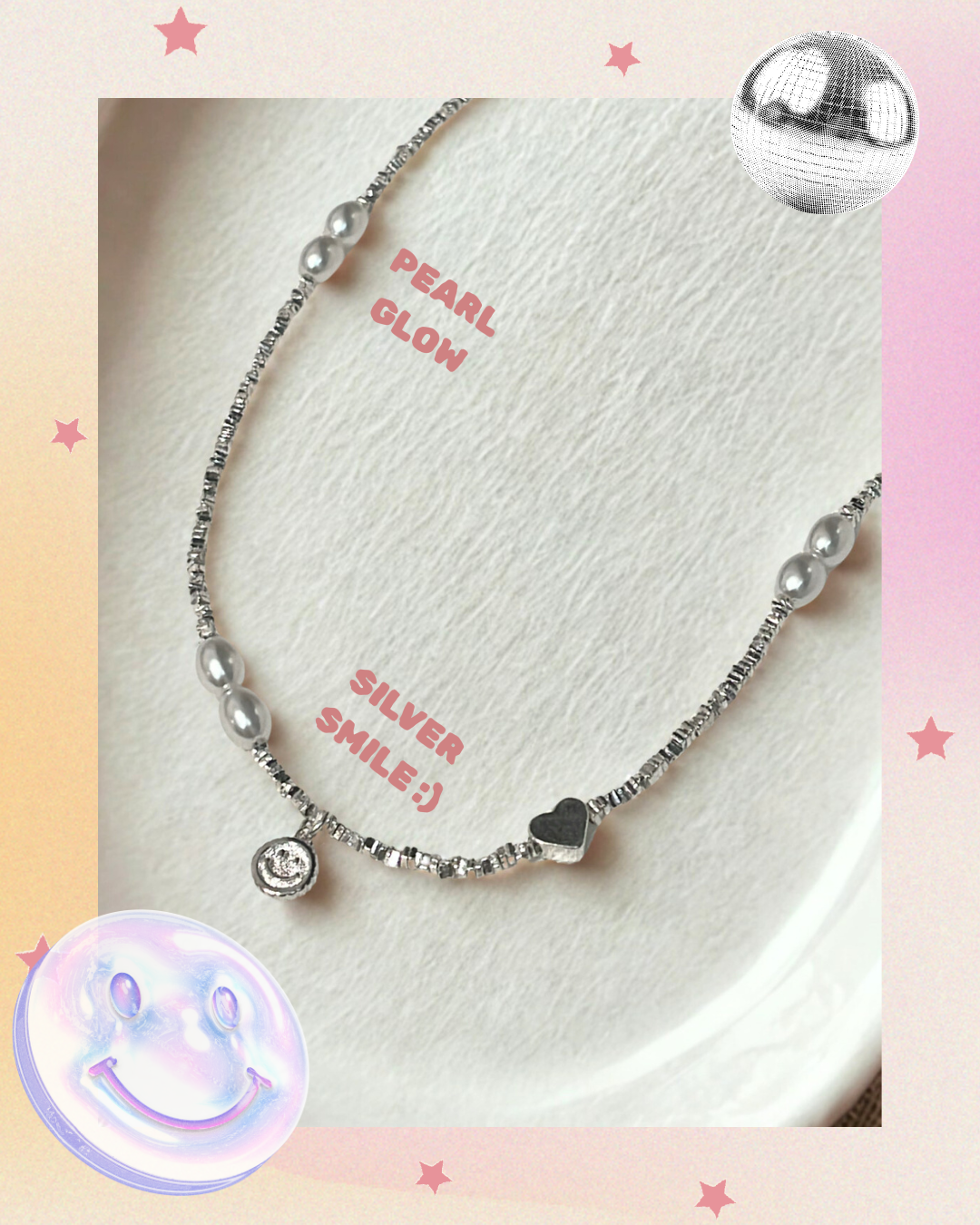 Smiley Face Silver Necklace🧚🏻 alongside a classy pearl, effortlessly mixing playful vibes with sleek style. A fresh twist on any outfit.